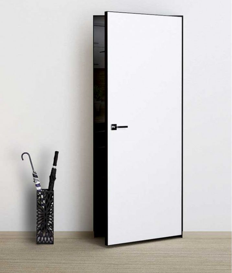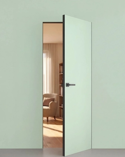 Скрытая дверь Инвизибл под покраску в скрытом коробе. Грунтованное покрытие для дальнейшего декорирования краской. Допустимо использование в помещениях с повышенной влажностью. Безопасно для здоровья и окружающей среды. Можно красить или клеить обои. Устанавливается вровень со стеной.