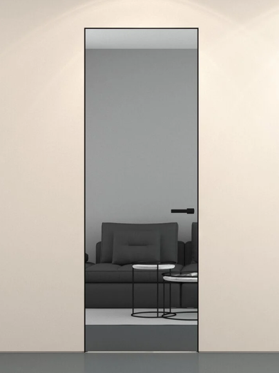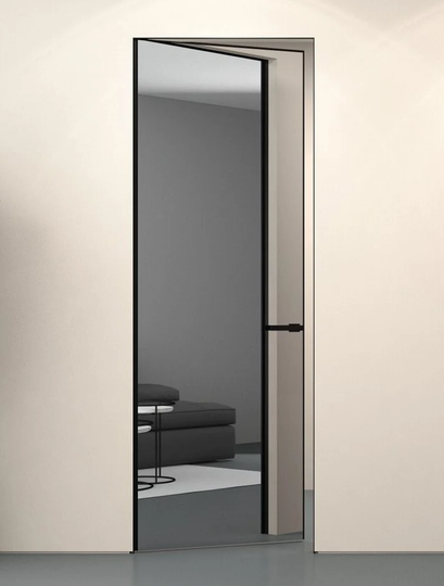 Каркасная дверь Hausdoors с зеркалом на лицевой части, с другой стороны под покраску, открывание внутрь. Полотна изготавливаются с фабричной фрезеровкой под замок 196 мм и петли AGB Eclipse 2.2. Со стороны зеркала предусмотрено одно или два отверстия - под ручку и фиксатор/цилиндр. Рекомендуется к установке ручка на круглой розетке диаметром не менее 52 мм.