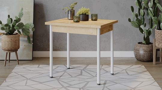 Стол имеет поворотно-раскладной механизм трансформации. Длина стола увеличивается вдвое: для этого нужно развернуть столешницу на 90 градусов и опустить верхнее крыло.