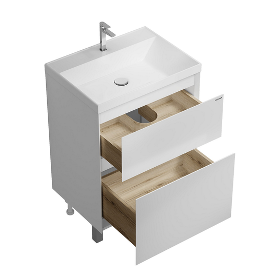 Тумба Меркадо 60 - стильное и функциональное решение для интерьеров в скандинавском и современном стиле. Корпус и фасады выполнены из МДФ в белой матовой краске. Фасады с точным запилом под 45° на торцах, что исключает видимую кромку и позволяет обходиться без ручек, создавая лаконичный и минималистичный дизайн. Два вместительных ящика изготовлены из ЛДСП «Дуб Эльвезия» и оснащены направляющими скрытого монтажа с доводчиком, обеспечивающими плавное и бесшумное закрывание. Тумба установлена на хромированные ножки высотой 10 см, а для надежного крепления предусмотрены подвесы в комплекте.