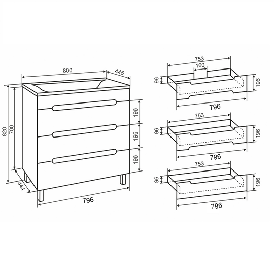 Тумба Olivia 80 оснащена тремя выдвижными ящиками на шариковых направляющих скрытого монтажа с доводчиками. Ящики легко открываются благодаря удобным вырезам на фасаде.