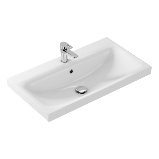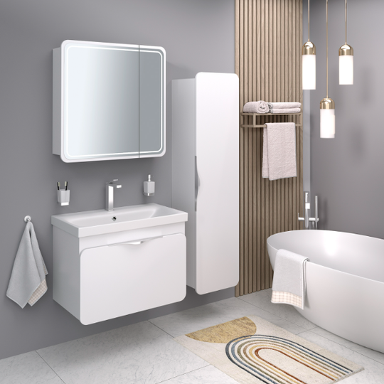 Тумба Skandi 80 оснащена двумя ящиками: внешним и внутренним. Внешний ящик на направляющих скрытого монтажа с доводчиком. Внутренний открывается с помощью механизма Push-to-Open. Корпус тумбы выполнен из ЛДСП, а фасад внешнего ящика - из МДФ. Лаконичным завершением общей композиции является стильная хромированная ручка.