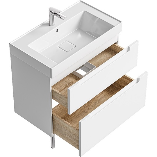 Тумба Ванкувер 81 на металлических ножках оснащена двумя ящиками с механизмами мягкого закрывания и тщательно организованным внутренним пространством с отделкой под дерево. Лаконичные фасады крашеные в белый цвет с интегрированной ручкой-зацепом подчеркивают чистоту форм и делают использование особенно удобным. Мебельный умывальник с декоративной вкладкой подчеркивает современный характер коллекции, а оптимальная глубина чаши обеспечивает комфортное ежедневное использование.