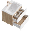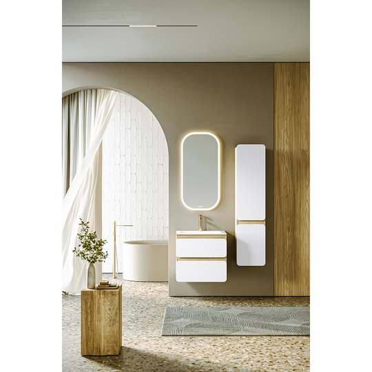 Созданная в стиле софт-минимализма, коллекция Vento отличается мягкой геометрией и визуальной тишиной. Скругленные фасады окрашены матовой краской, также они выполняют функцию скрытых ручек. Древесный корпус из ЛДСП в оттенке светлой акации. Тумбы Vento оснащены умывальниками Malaga из литьевого мрамора, сочетающими четкую геометрию с мягкой пластикой линий. Глубокая практичная чаша обеспечивает комфортность в использовании, а декоративная заглушка в сливной зоне сохраняет чистоту поверхности и архитектурную строгость. Внутреннее пространство продумано до мелочей: дно ящиков выполнено в цвет корпуса, а в верхний ящик установлена система организации внутреннего пространства в виде трех перегородок из ЛДСП.