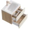 Созданная в стиле софт-минимализма, коллекция Vento отличается мягкой геометрией и визуальной тишиной. Скругленные фасады окрашены матовой краской, также они выполняют функцию скрытых ручек. Древесный корпус из ЛДСП в оттенке светлой акации. Тумбы Vento оснащены умывальниками Malaga из литьевого мрамора, сочетающими четкую геометрию с мягкой пластикой линий. Глубокая практичная чаша обеспечивает комфортность в использовании, а декоративная заглушка в сливной зоне сохраняет чистоту поверхности и архитектурную строгость. Внутреннее пространство продумано до мелочей: дно ящиков выполнено в цвет корпуса, а в верхний ящик установлена система организации внутреннего пространства в виде трех перегородок из ЛДСП.