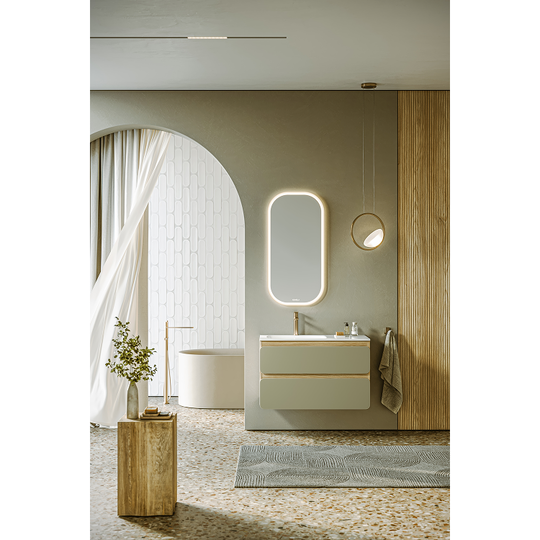 Созданная в стиле софт-минимализма, коллекция Vento отличается мягкой геометрией и визуальной тишиной. Скругленные фасады окрашены матовой краской, также они выполняют функцию скрытых ручек. Древесный корпус из ЛДСП в оттенке светлой акации. Тумбы Vento оснащены умывальниками Malaga из литьевого мрамора, сочетающими четкую геометрию с мягкой пластикой линий. Глубокая практичная чаша обеспечивает комфортность в использовании, а декоративная заглушка в сливной зоне сохраняет чистоту поверхности и архитектурную строгость. Версия тумбы 90 см с асимметричным умывальником, смещенным влево, благодаря чему все необходимое под рукой. Внутреннее пространство тумбы продумано до мелочей: дно ящиков выполнено в цвет корпуса, а в верхний ящик установлена система организации внутреннего пространства в виде трех перегородок из ЛДСП.