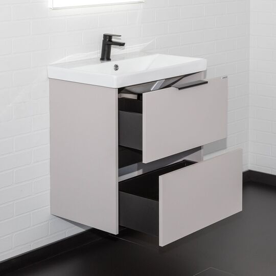 Подвесная тумба Comforty Селенга 60 с двумя вместительными выдвижными ящиками. Направляющие ящиков оборудованы системой плавного закрывания. Верхний ящик открывается черной профильной ручкой. Ручку устанавливать необязательно. Верхний ящик можно открыть за нижний край фасада. Для открытия нижнего ящика нужно потянуть верхний край фасада. Ящики выполнены из ВЛДСП контрастного черного цвета. Тумба подготовлена для подключению коммуникаций снизу и сзади.