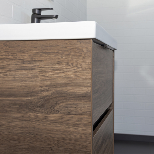 Подвесная тумба Comforty Селенга 80 с двумя вместительными выдвижными ящиками. Направляющие ящиков оборудованы системой плавного закрывания. Верхний ящик открывается черной профильной ручкой. Для открытия нижнего ящика нужно потянуть верхний край фасада. Ящики выполнены из ВЛДСП контрастного серого цвета. Тумба подготовлена для подключению коммуникаций снизу и сзади.