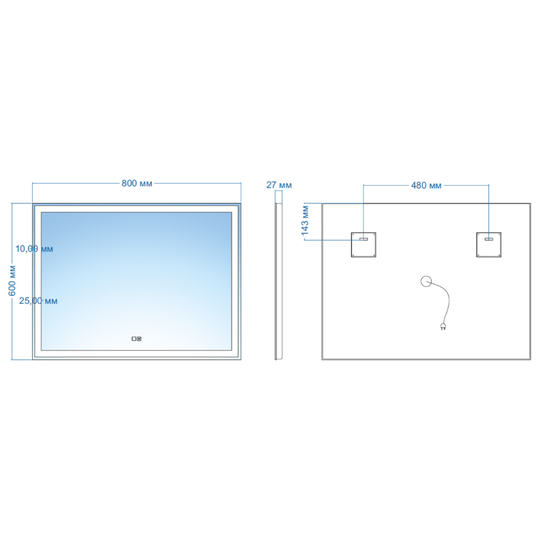 Зеркало оснащено сенсорным выключателем с функцией плавного диммирования, с запоминанием последнего значения. Короткое касание светящейся области включают/выключают подсветку, длительное касание меняет яркость свечения.