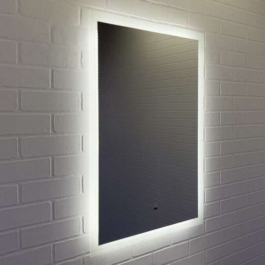 Высококачественное зеркальное полотно с амальгамой на основе серебра. Зеркало оборудовано ореольной и фронтальной Led подсветкой с бесконтактным включателем со встроенной функцией регулировки яркости (диммирования). Температура подсветки: 6000-6500К холодная. Основание зеркала - короб из пластика. Светодиодная лента в силиконовом профиле.
