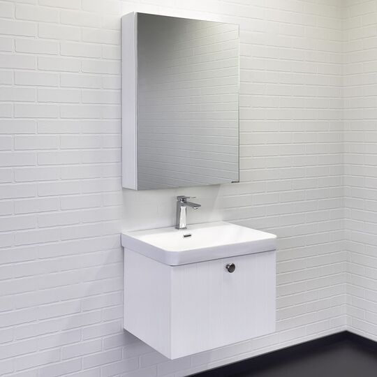 Высококачественное зеркальное полотно с амальгамой на основе серебра. Створка оснащена петлями с плавным закрыванием. Корпус зеркального шкафа выполнен из МДФ и облицован пленкой имитирующей текстуру натурального дерева ясень беленый. Для открытия створки нужно потянуть за нижний край фасада. За створкой две горизонтальные полки из влагостойкого ЛДСП. Петли у створок снаружи. Зеркало-шкаф универсально - может быть подвешено в правом и левом варианте.
