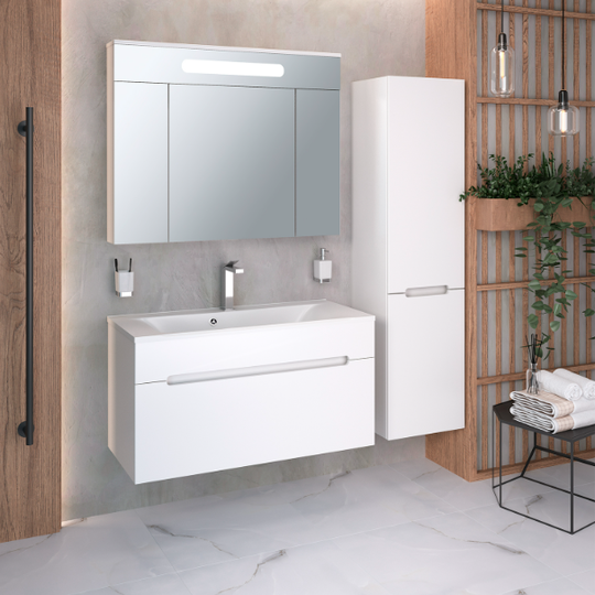 Зеркало-шкаф Olivia 100 оснащен тремя распашными зеркальными дверцами. Блок розетка/выключатель расположен внутри шкафа. Полки под хранение обеспечивают порядок внутри. Петли на дверцах со встроенным доводчиком.